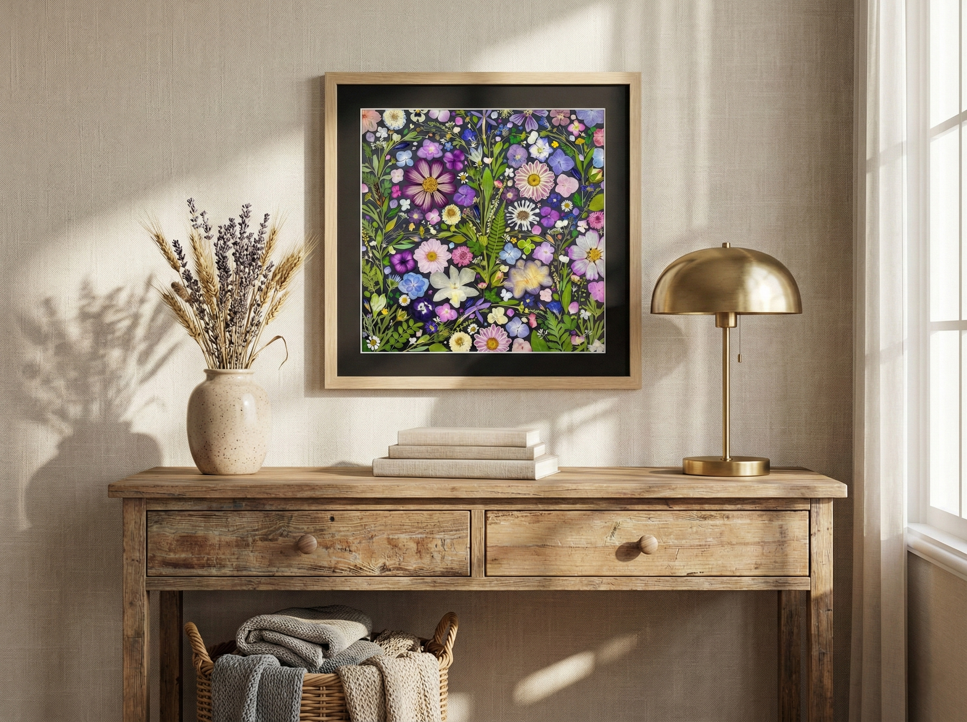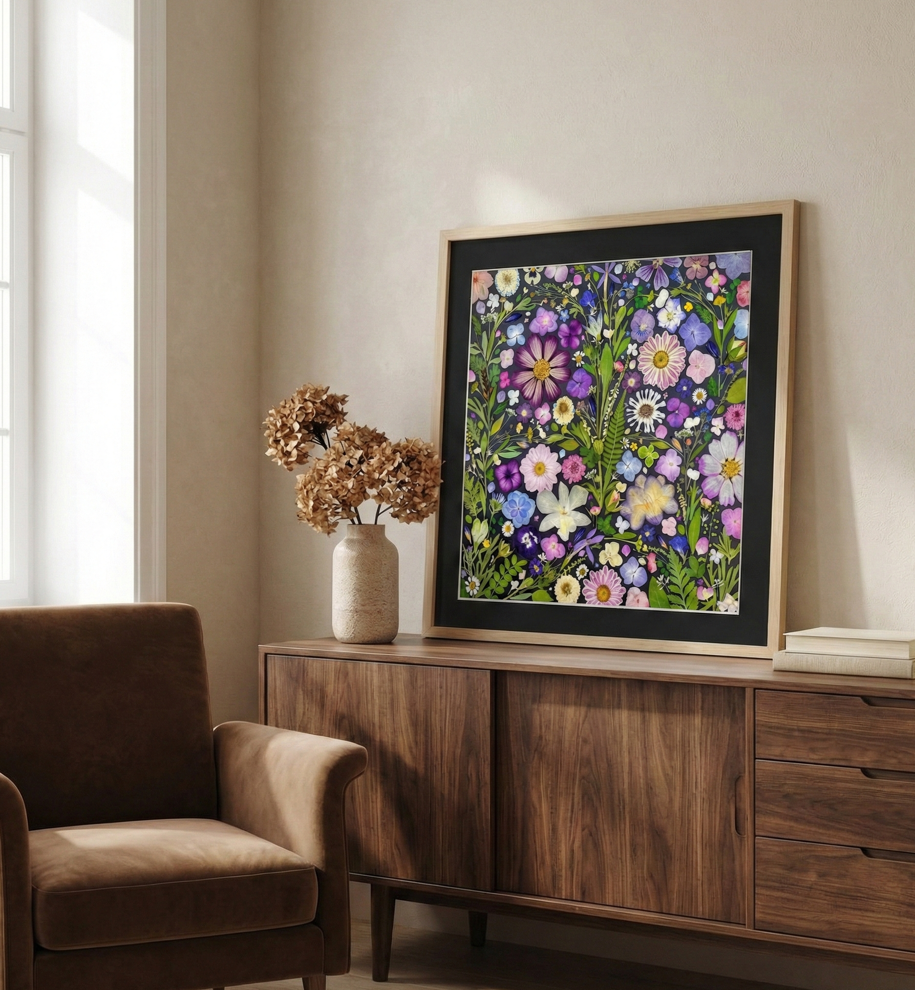 L'œuvre est recouverte d'une plaque acrylique transparente et scellée par un support en aluminium afin d'accroître sa longévité et de préserver sa beauté botanique.