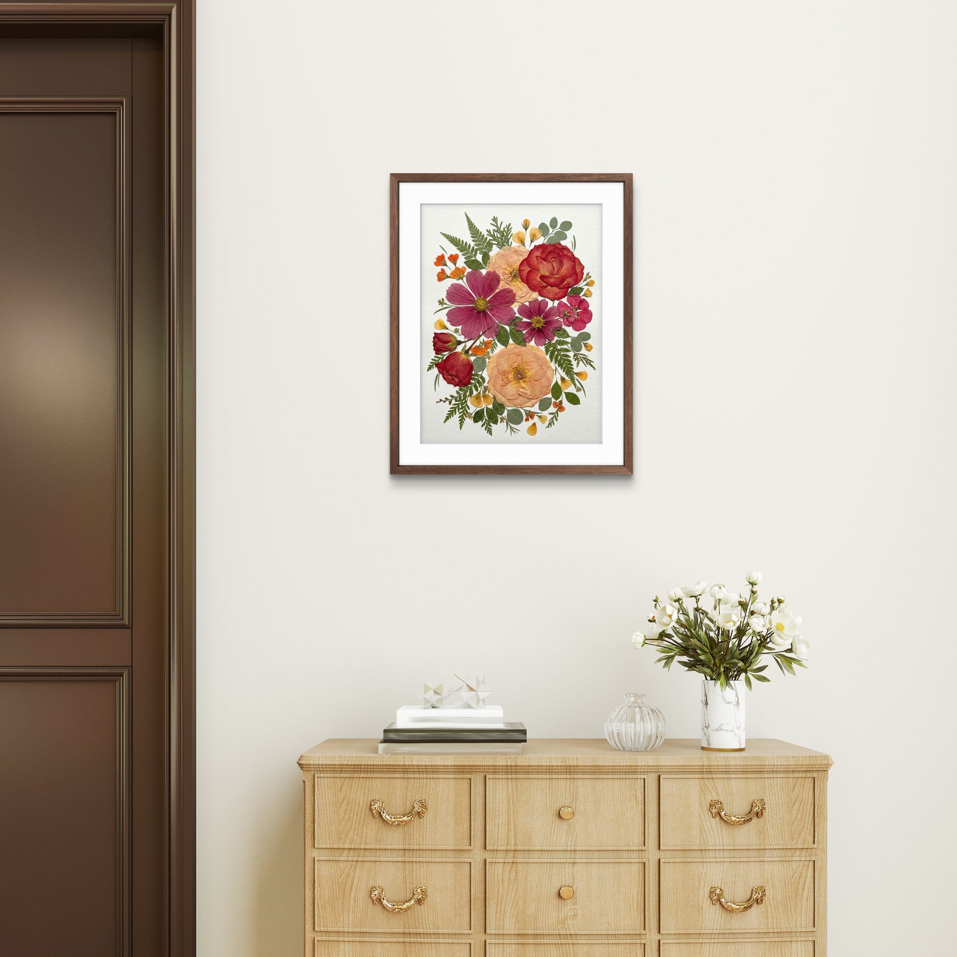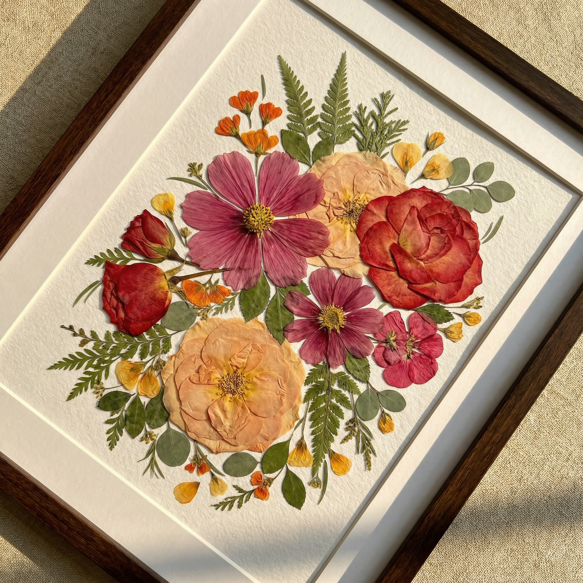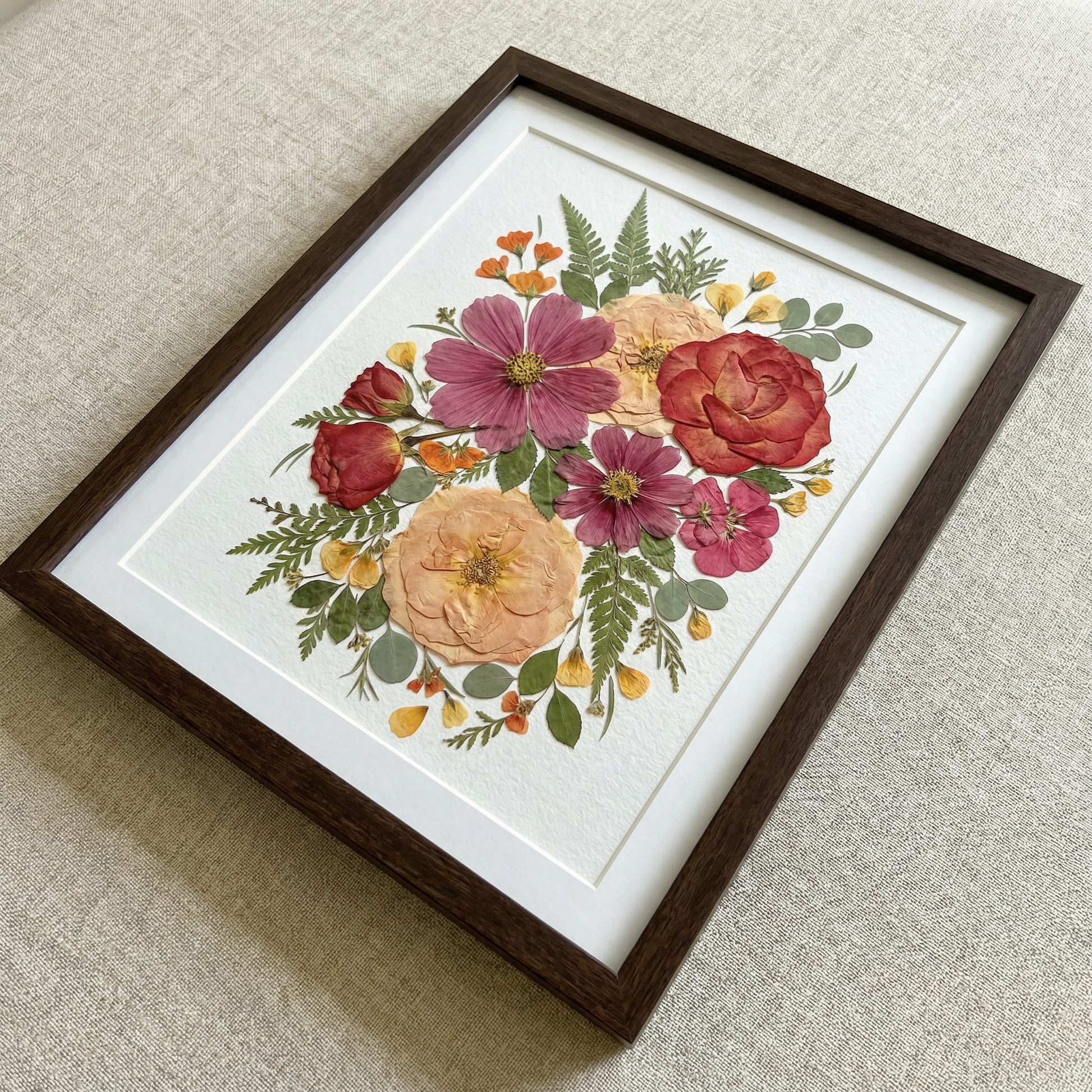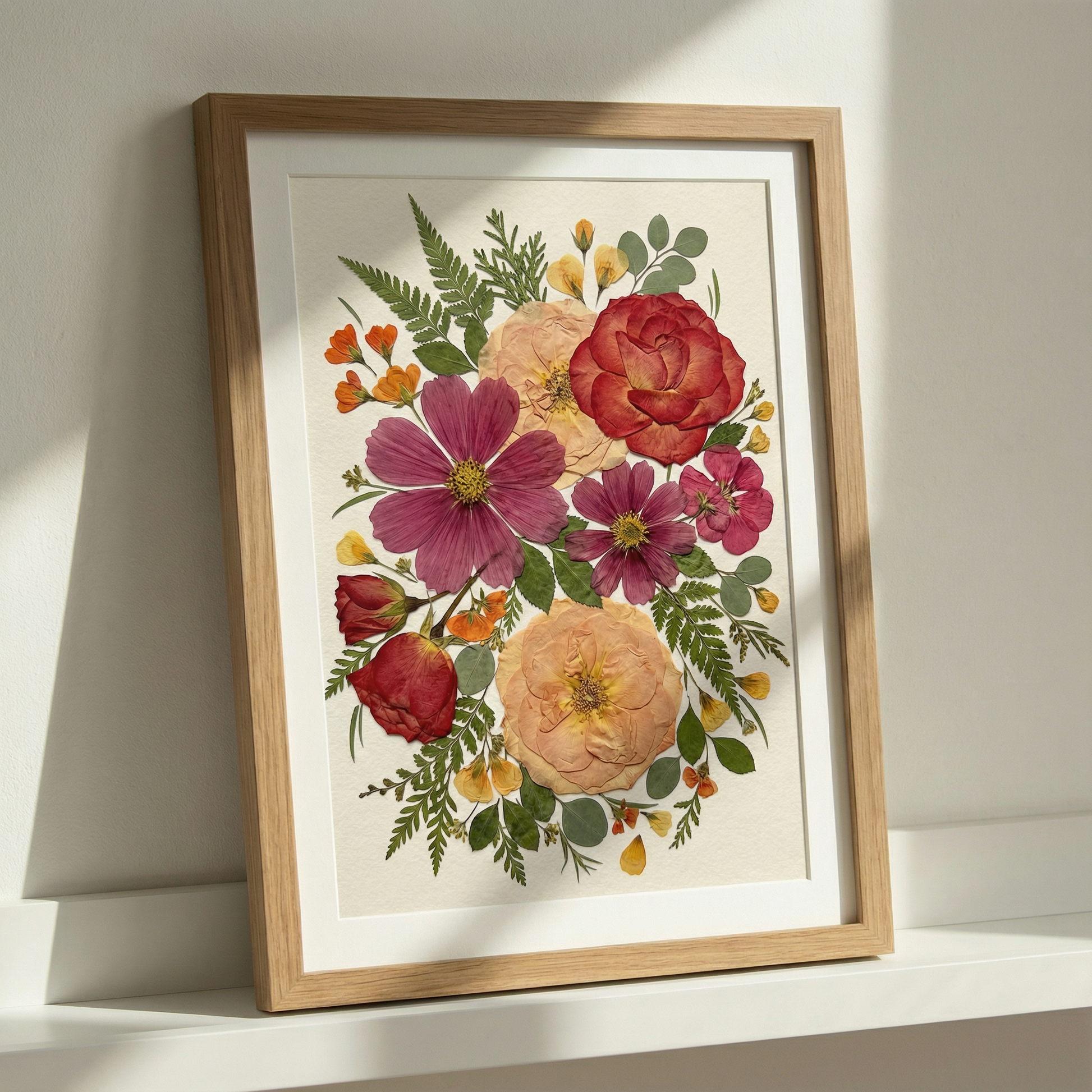 Notre fleuriste dispose et colle avec soin des pétales de fleurs séchées sur un fond en papier, créant ainsi un motif unique. Chaque pétale provient des plus belles fleurs de saison, méticuleusement sélectionnées et pressées par nos fleuristes expérimentés.