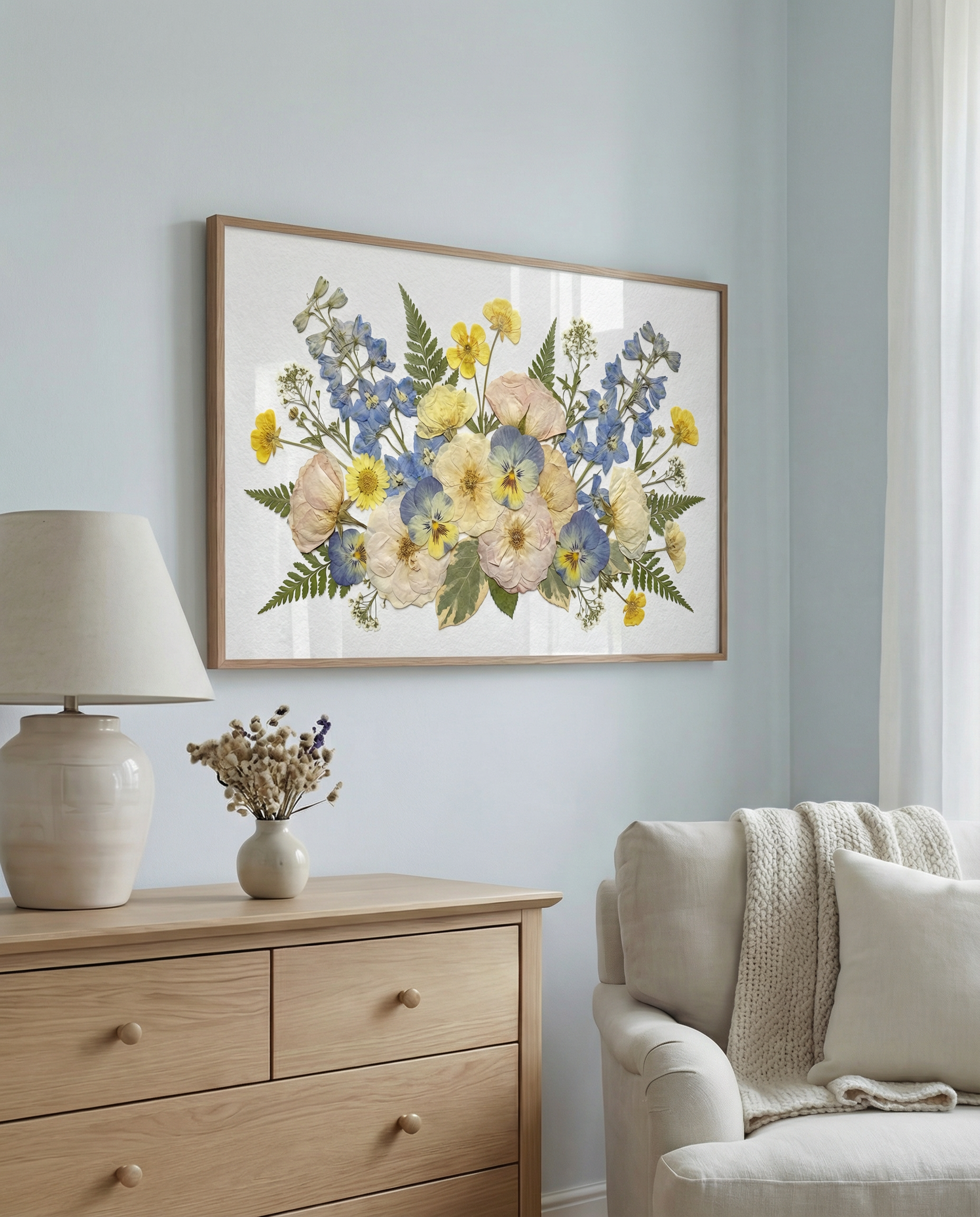 Notre fleuriste dispose et colle avec soin des pétales de fleurs séchées sur un fond en papier, créant ainsi un motif unique. Chaque pétale provient des plus belles fleurs de saison, méticuleusement sélectionnées et pressé par nos fleuristes qualifiés.