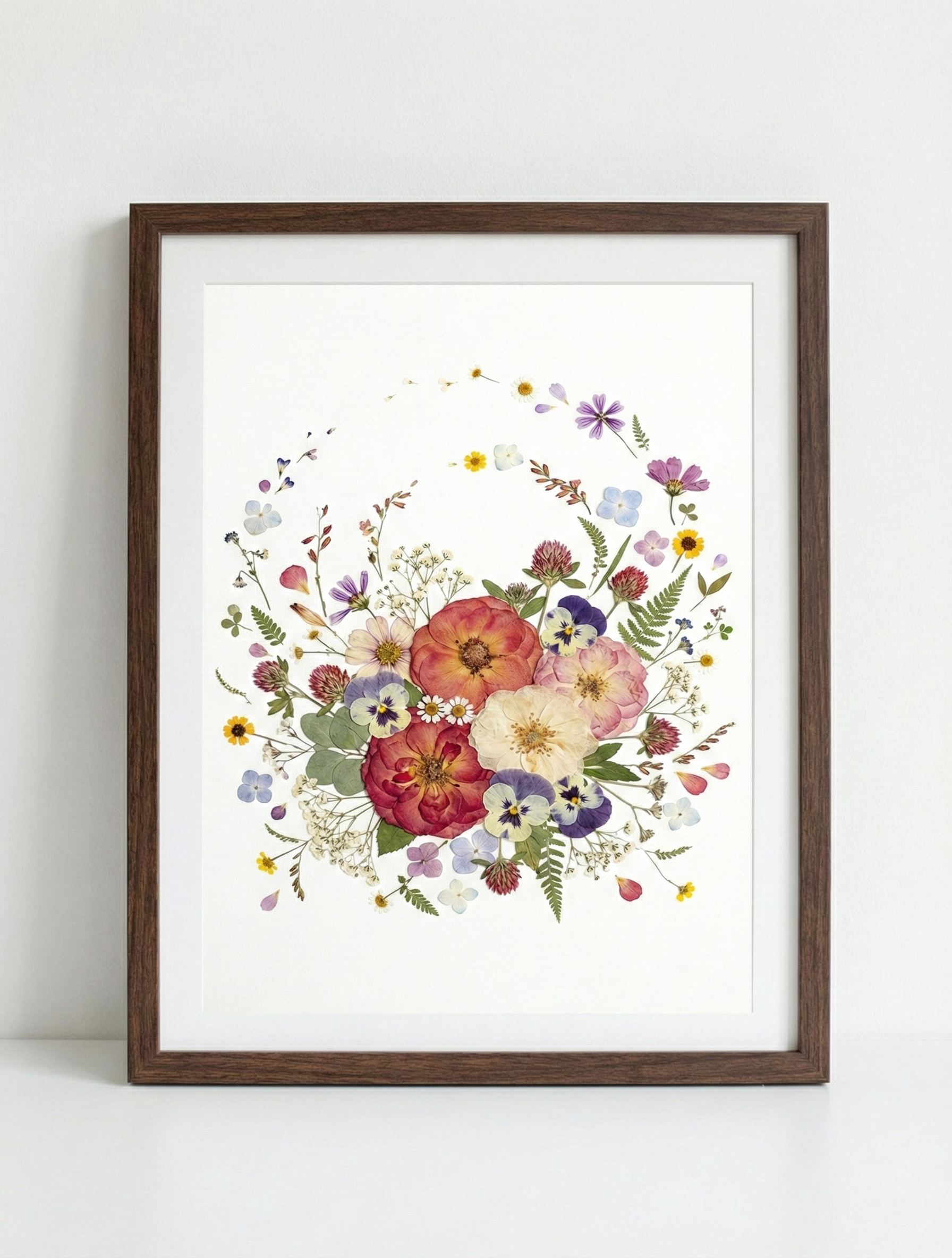 Capturez la beauté éphémère d'un jardin vibrant avec ce magnifique cadre de fleurs pressées. Chaque élément botanique, des roses de jardin veloutées et charmantes pensées aux délicates frondes de fougère et minuscules fleurons d'hortensia, a été méticuleusement préservé pour conserver son attrait naturel.