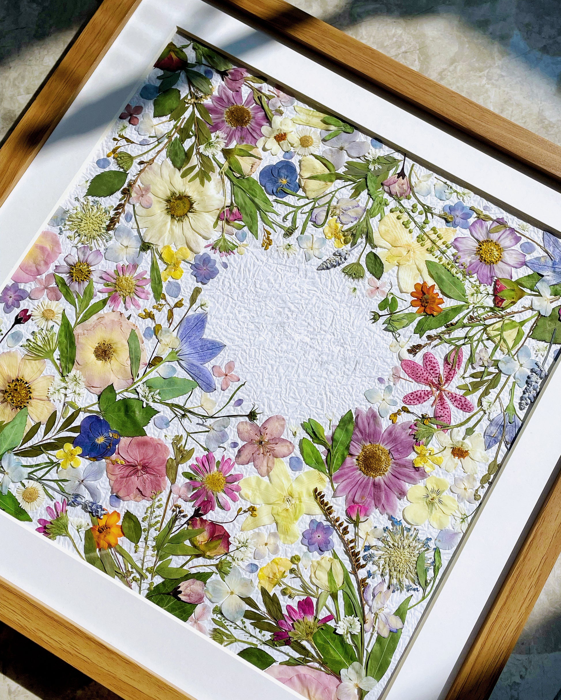 ▪ Détails du produit : Il s'agit d'une œuvre d'art encadrée de fleurs pressées de grande taille. Notre fleuriste dispose et colle soigneusement des pétales de fleurs séchées sur un papier de fond, créant ainsi un motif unique. Chaque pétale provient des plus belles fleurs de saison, méticuleusement sélectionnées et pressé par nos fleuristes qualifiés.