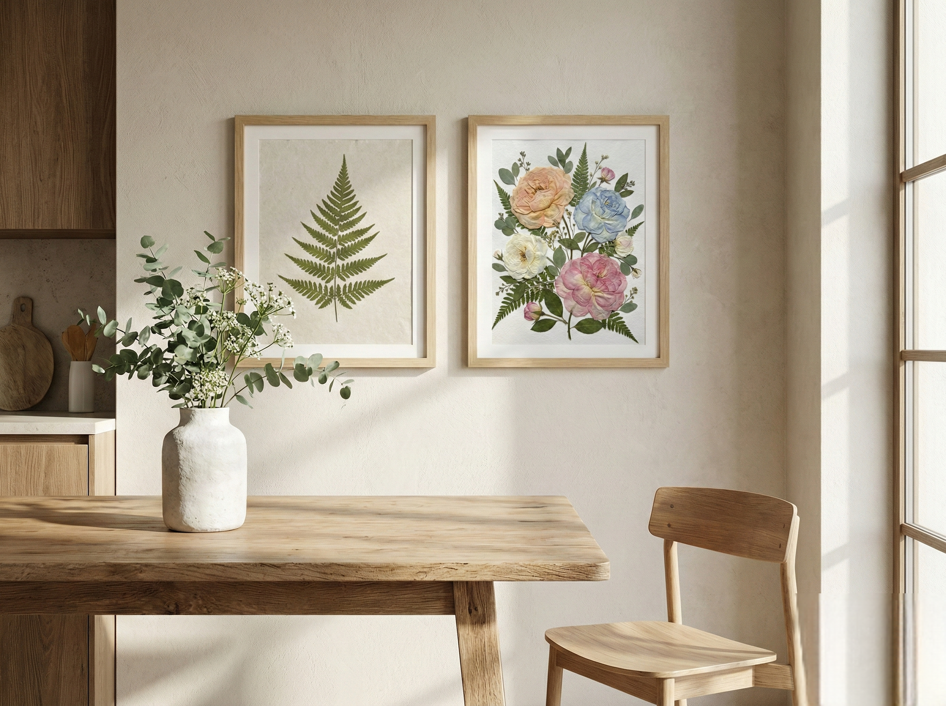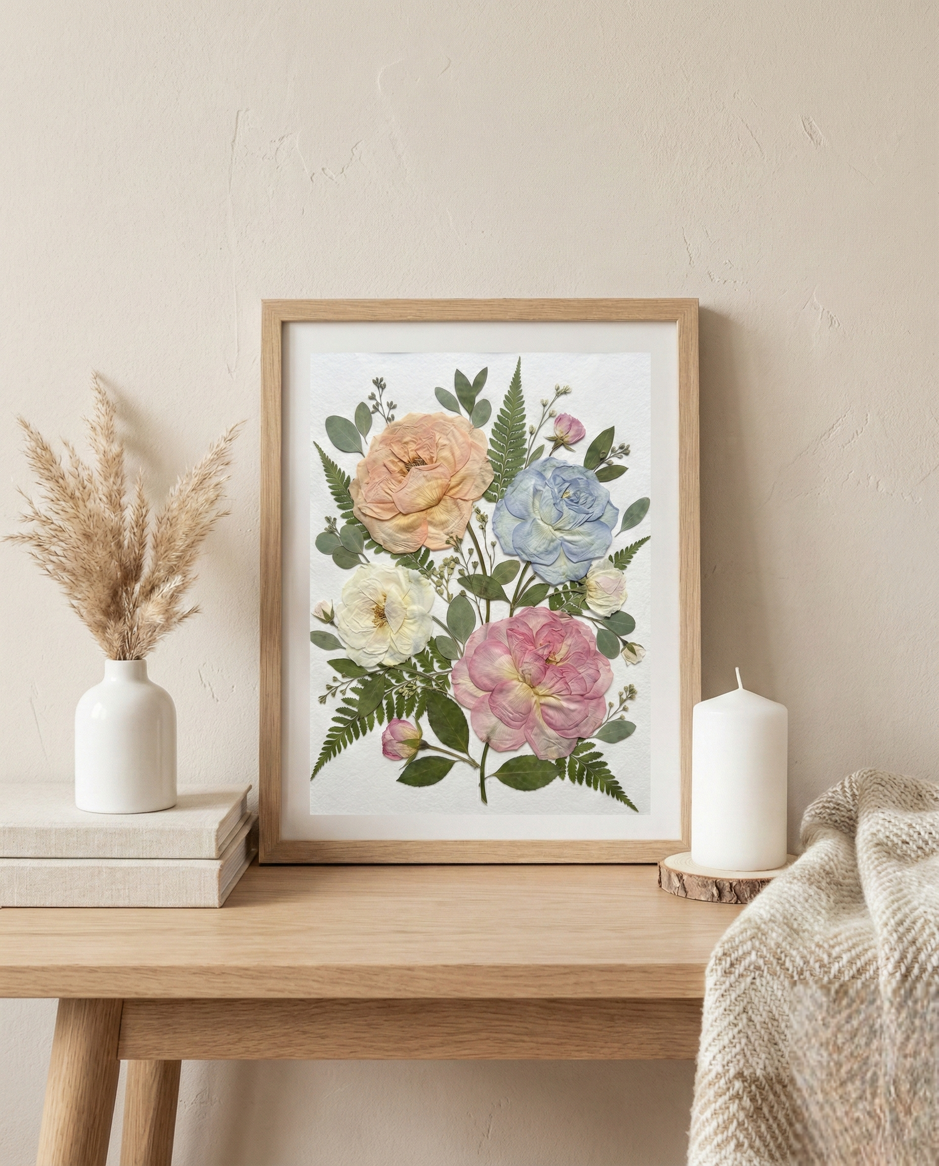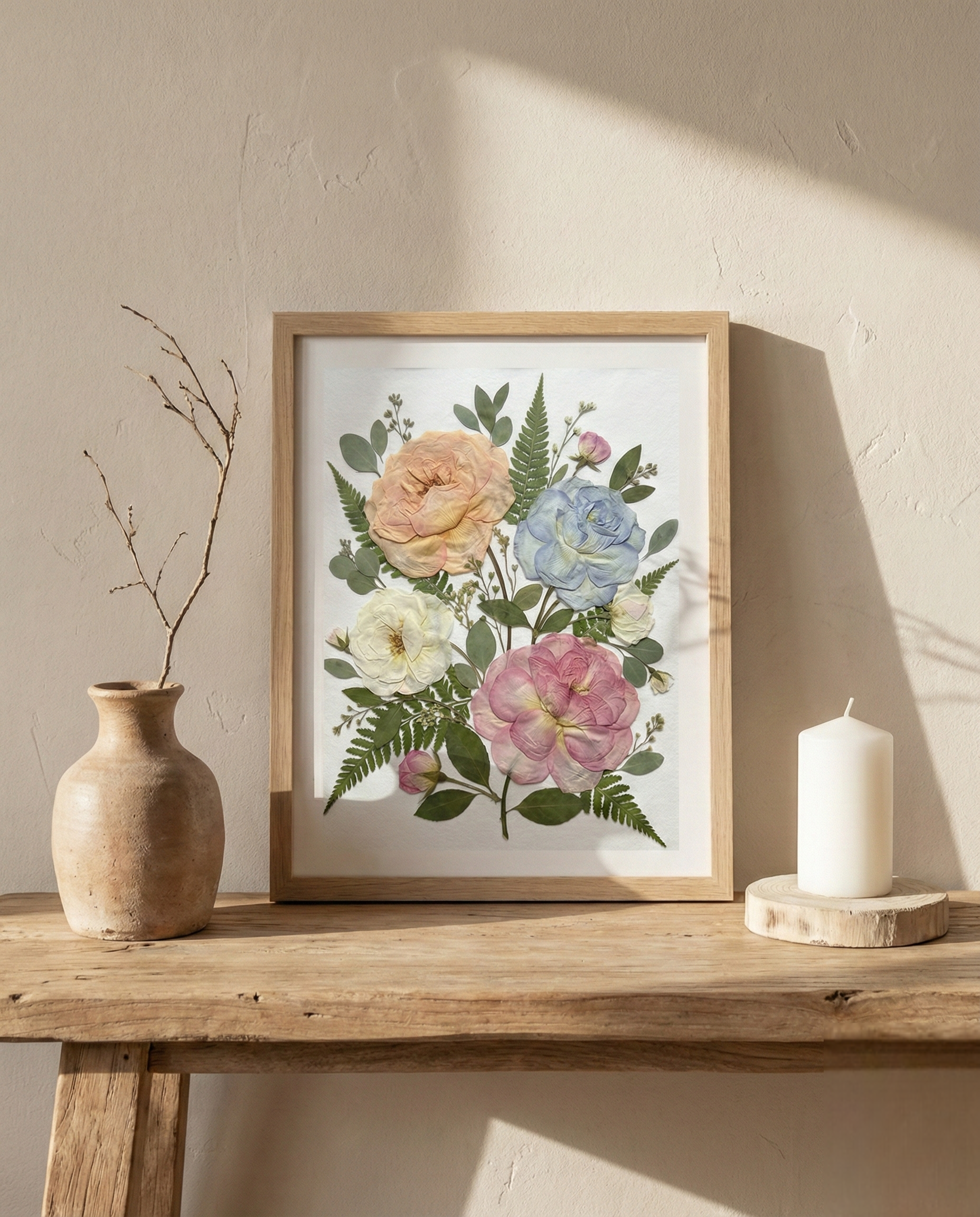 Notre fleuriste dispose et colle avec soin des pétales de fleurs séchées sur un fond en papier, créant ainsi un motif unique. Chaque pétale provient des plus belles fleurs de saison, méticuleusement sélectionnées et pressées par nos fleuristes expérimentés.