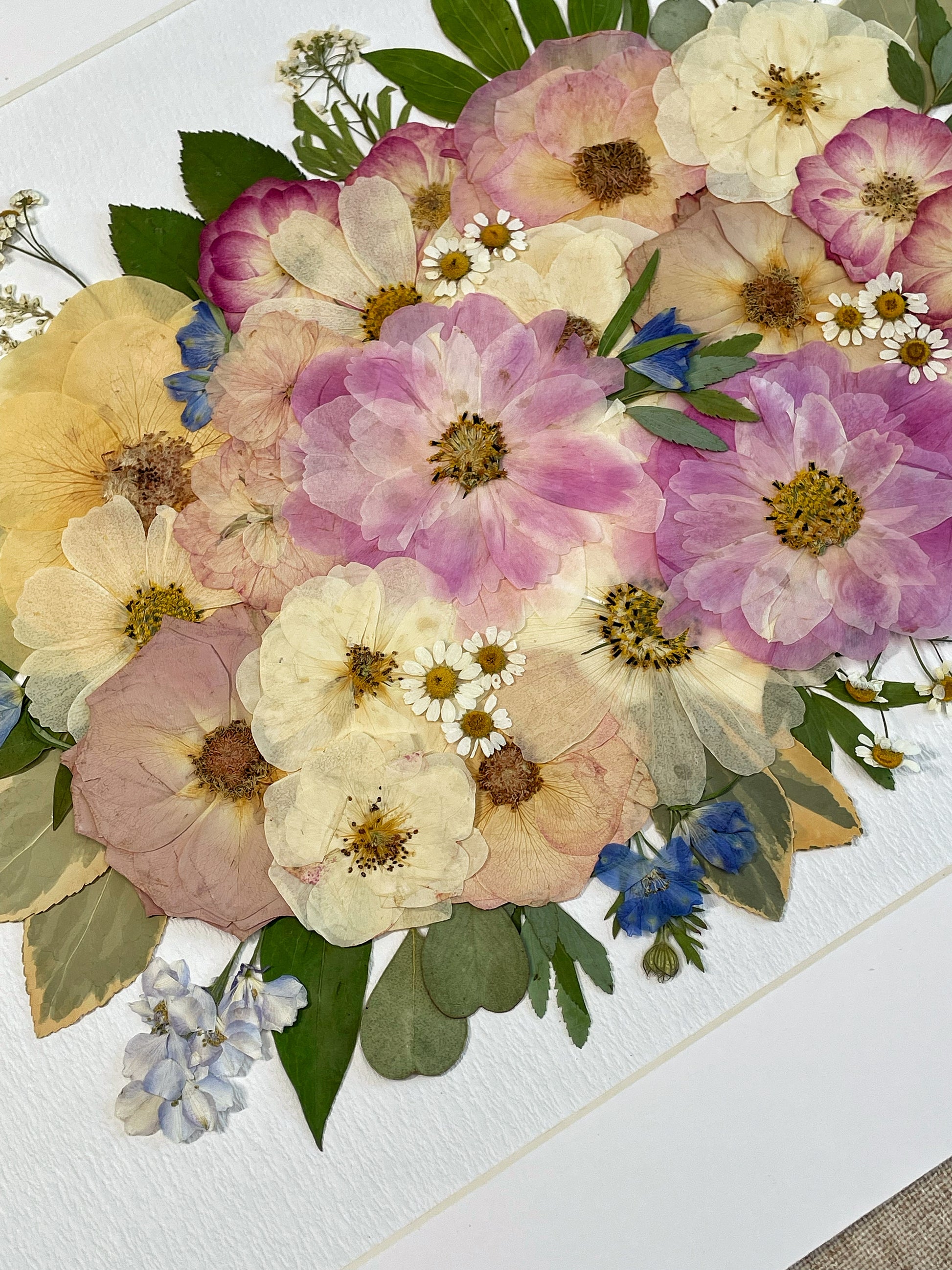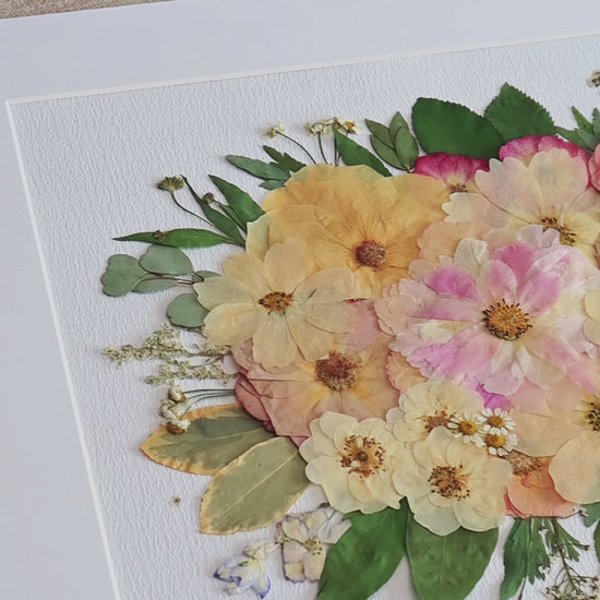 Les images du produit présentent un Cadre 15,5 po x 20 po. Notre fleuriste dispose et colle soigneusement des pétales de fleurs séchées sur un fond en papier, créant ainsi un motif unique. Chaque pétale provient des plus belles fleurs de saison, méticuleusement sélectionnées et pressé par nos fleuristes qualifiés.