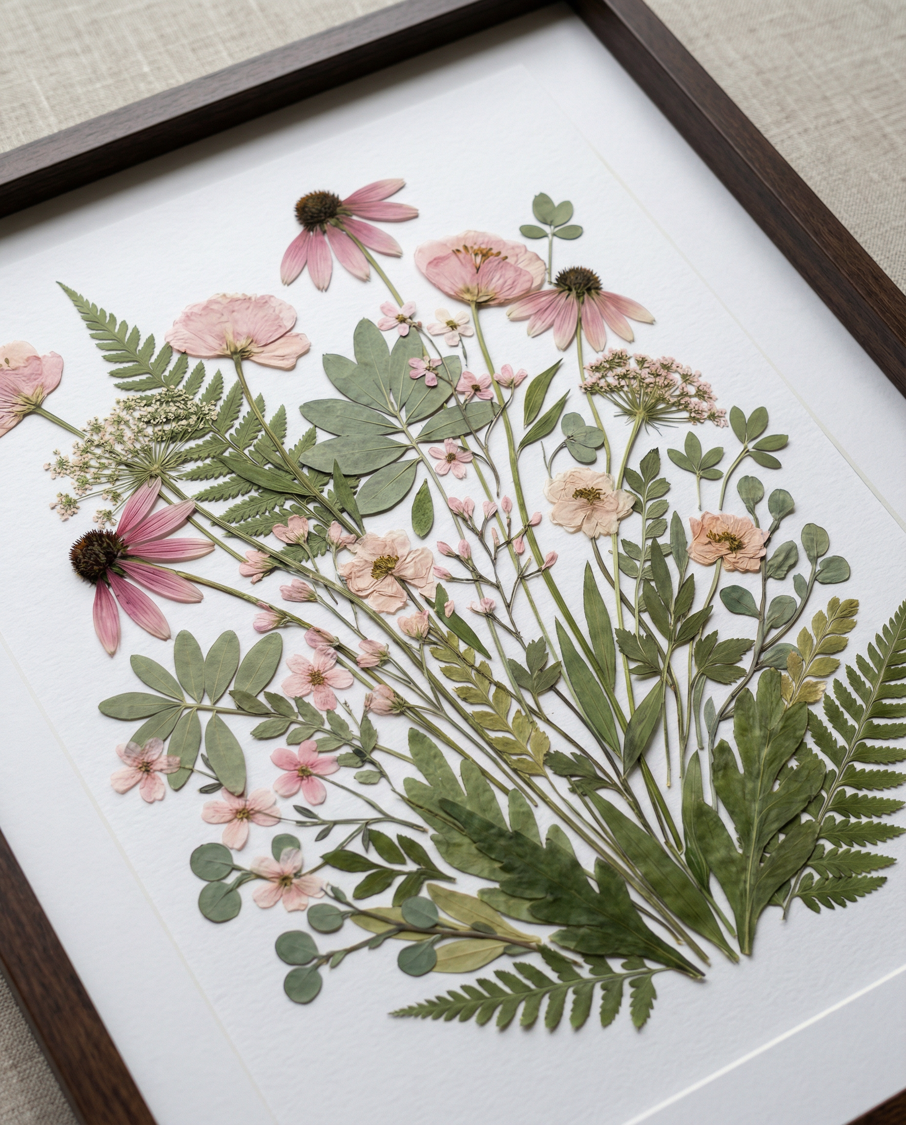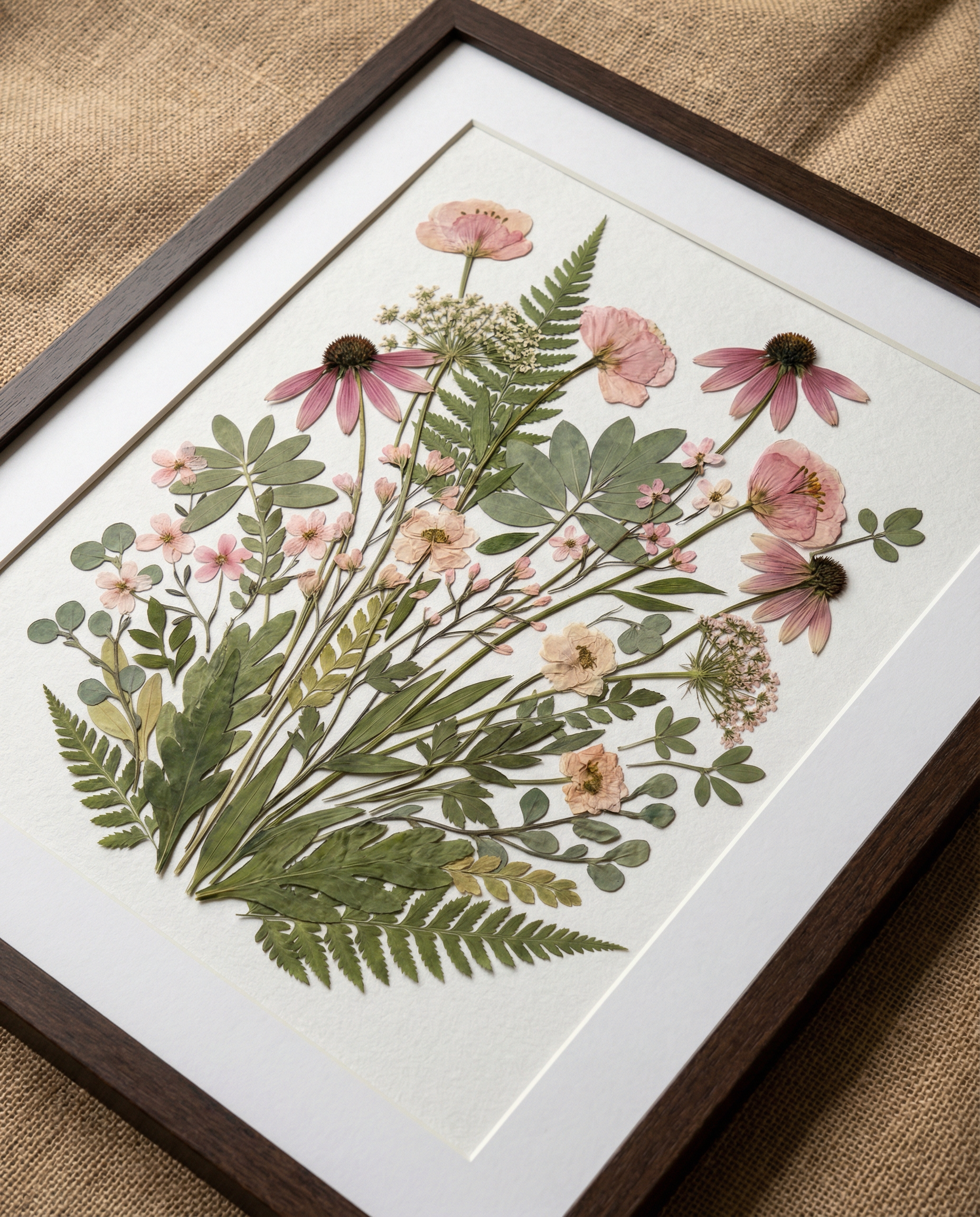 ▪ Matériaux : Échinacées roses, fleurs douces de style anémone rose poudré, gypsophile et délicates fleurs sauvages roses, accompagnées de feuilles d’eucalyptus, de feuillages ronds de prairie et de frondes de fougère superposées.
