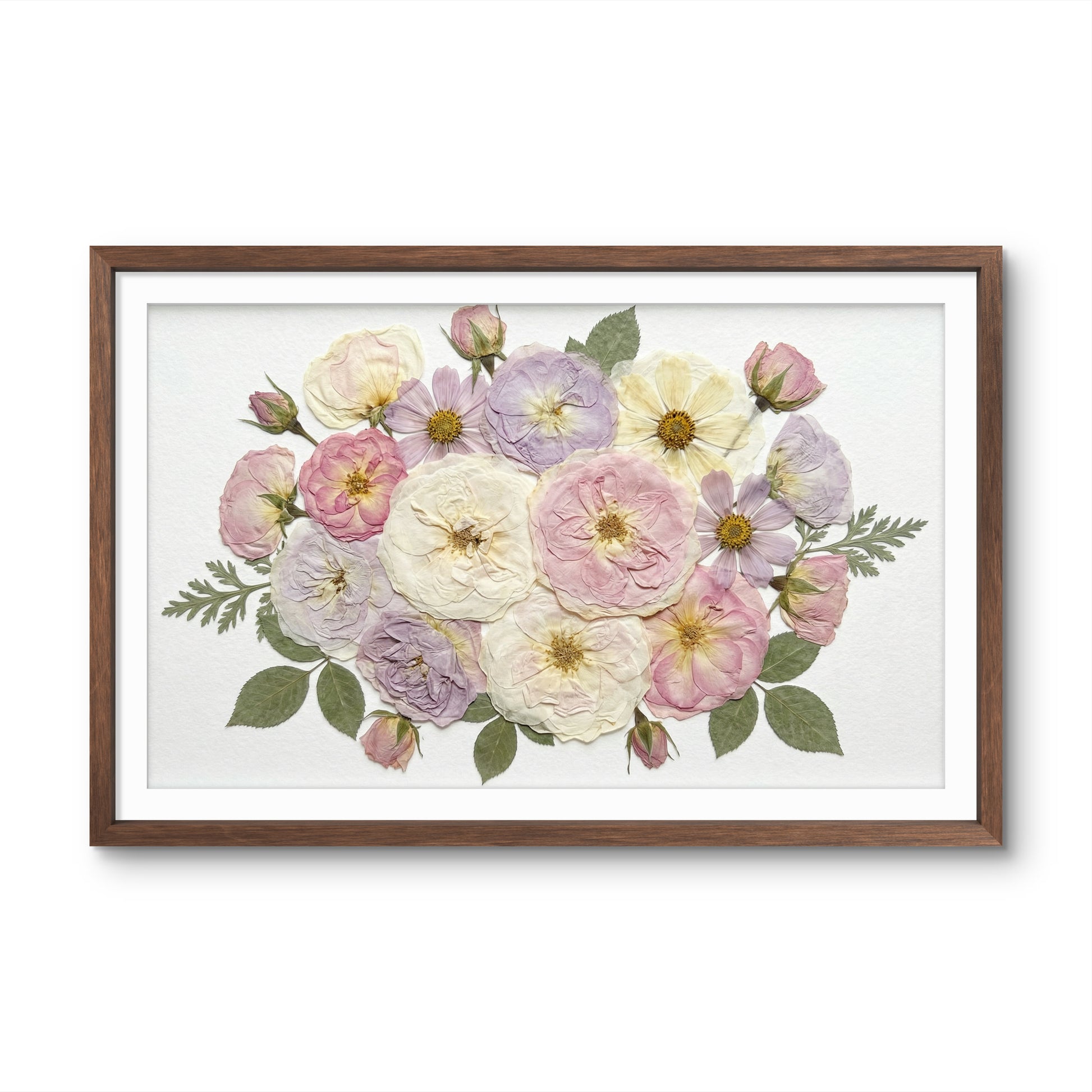 Notre fleuriste dispose et colle avec soin des pétales de fleurs séchées sur un fond en papier, créant ainsi un motif unique. Chaque pétale provient des plus belles fleurs de saison, méticuleusement sélectionnées et pressé par nos fleuristes qualifiés.