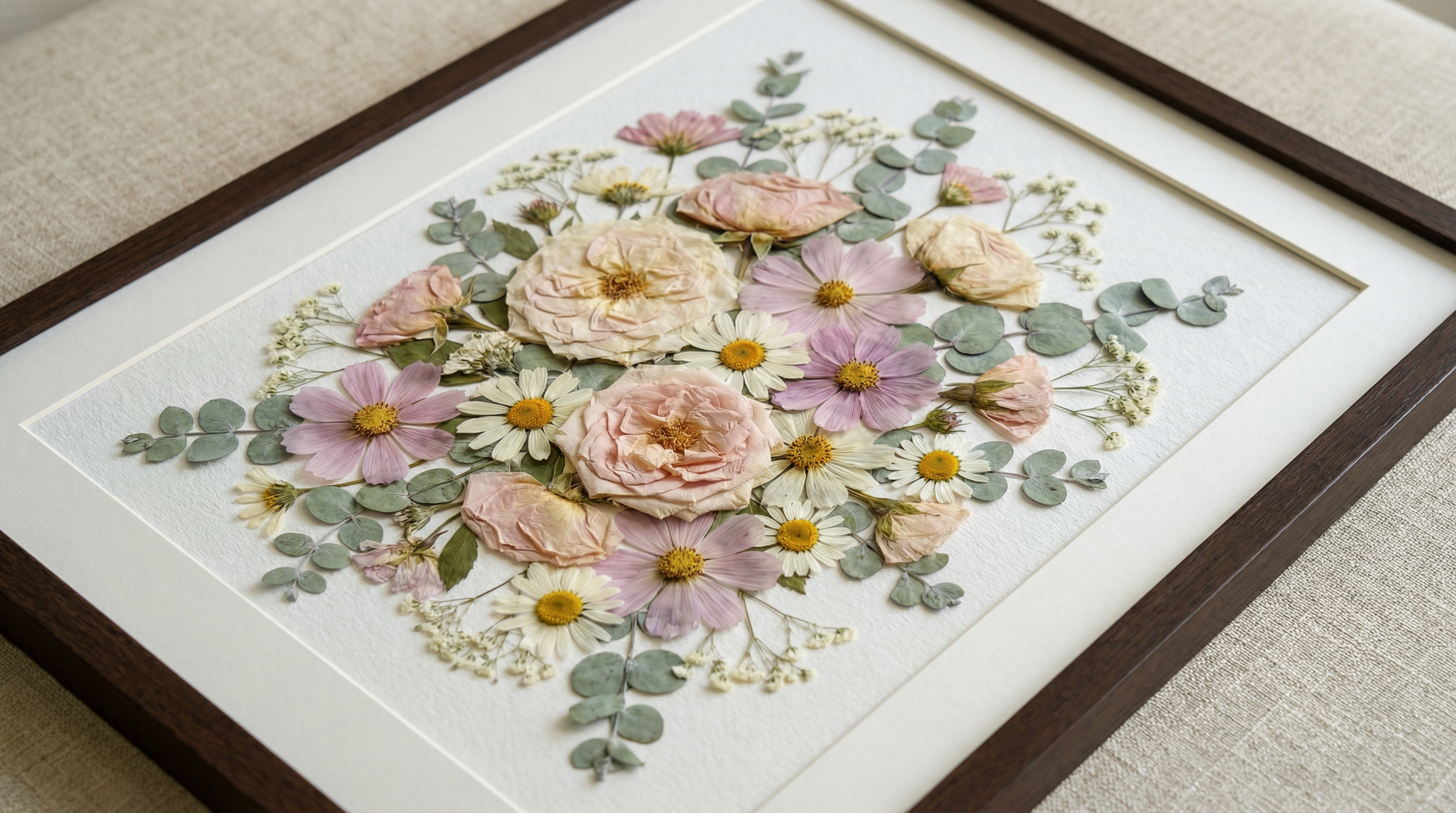 Notre fleuriste dispose et colle avec soin des pétales de fleurs séchées sur un fond en papier, créant ainsi un motif unique. Chaque pétale provient des plus belles fleurs de saison, méticuleusement sélectionnées et pressées par nos fleuristes expérimentés.