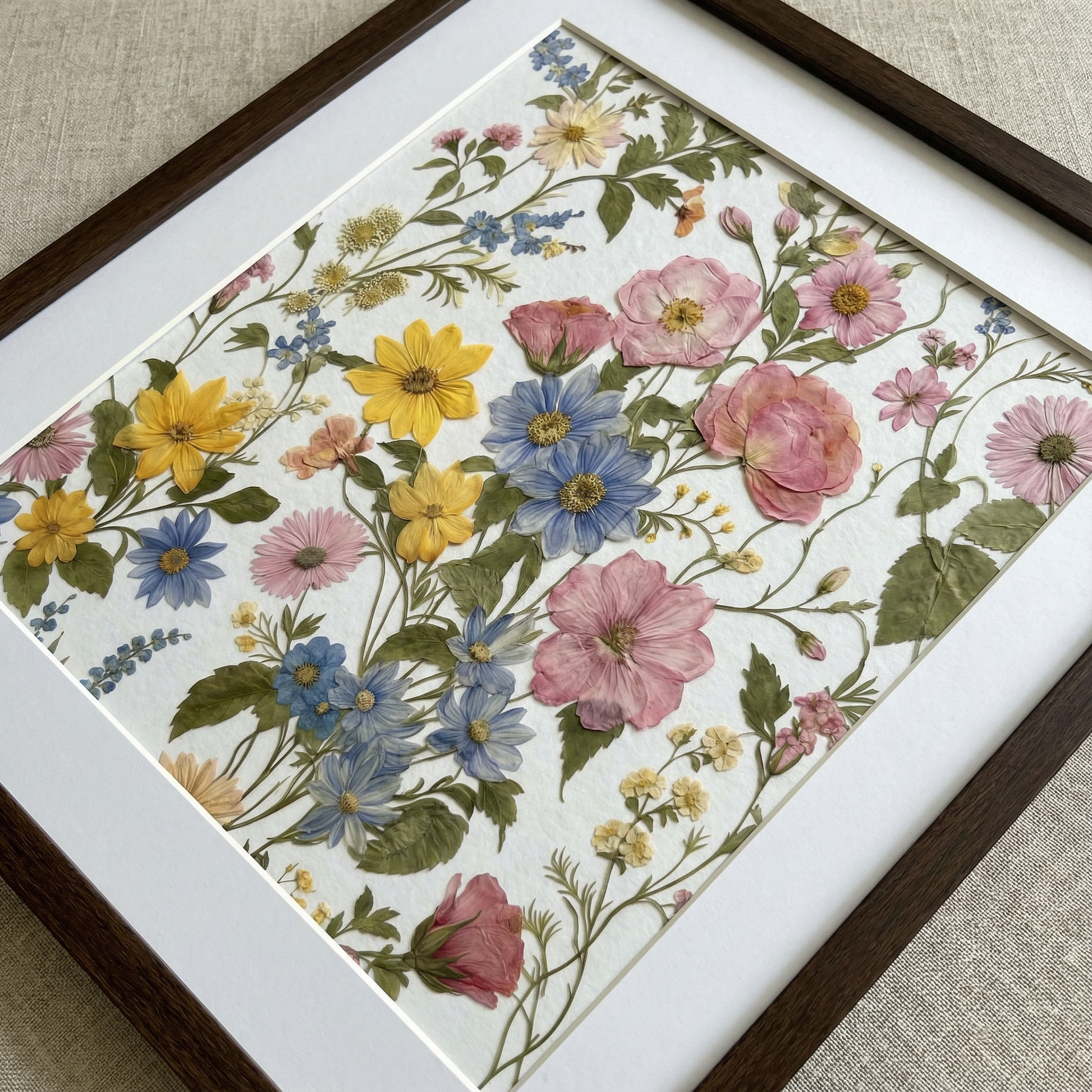 Notre fleuriste dispose et colle avec soin des pétales de fleurs séchées sur un fond en papier, créant ainsi un motif unique. Chaque pétale provient des plus belles fleurs de saison, méticuleusement sélectionnées et pressées par nos fleuristes expérimentés.