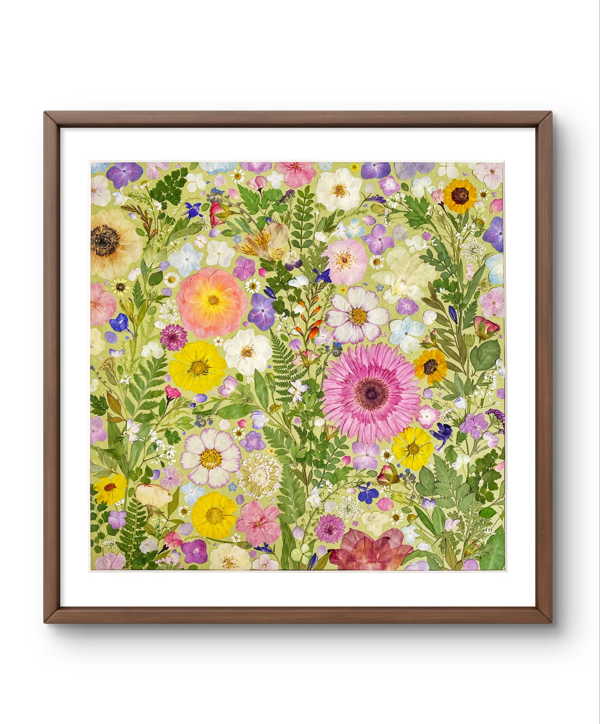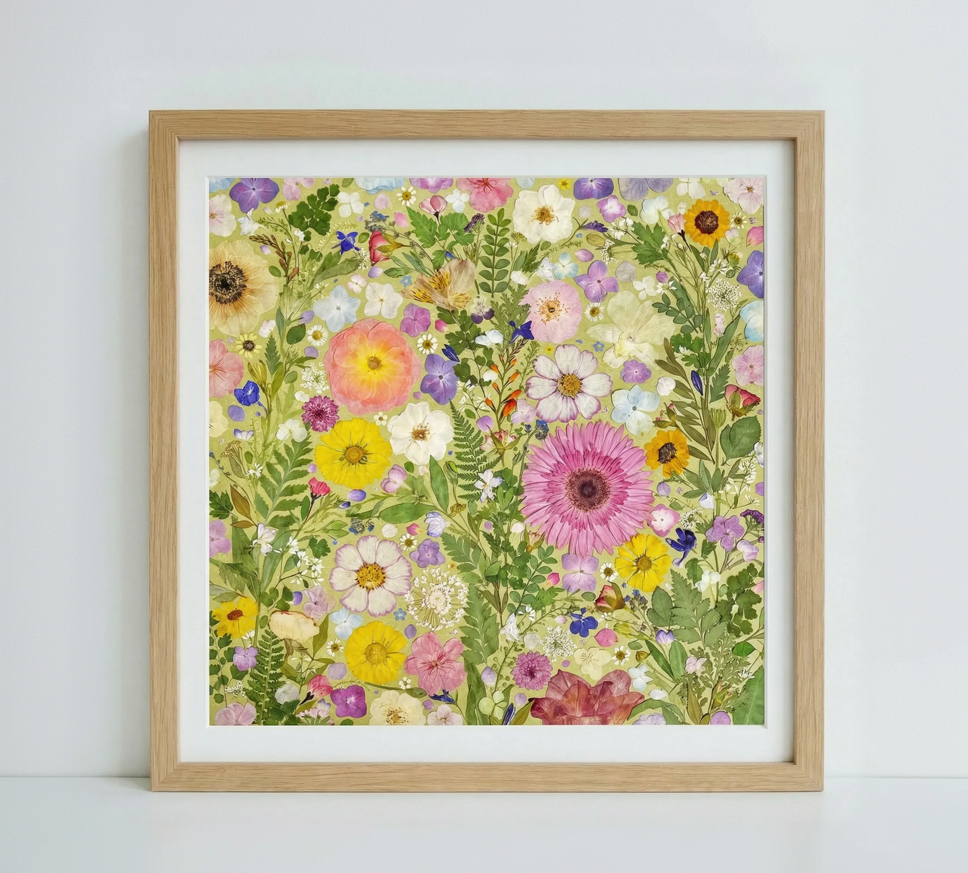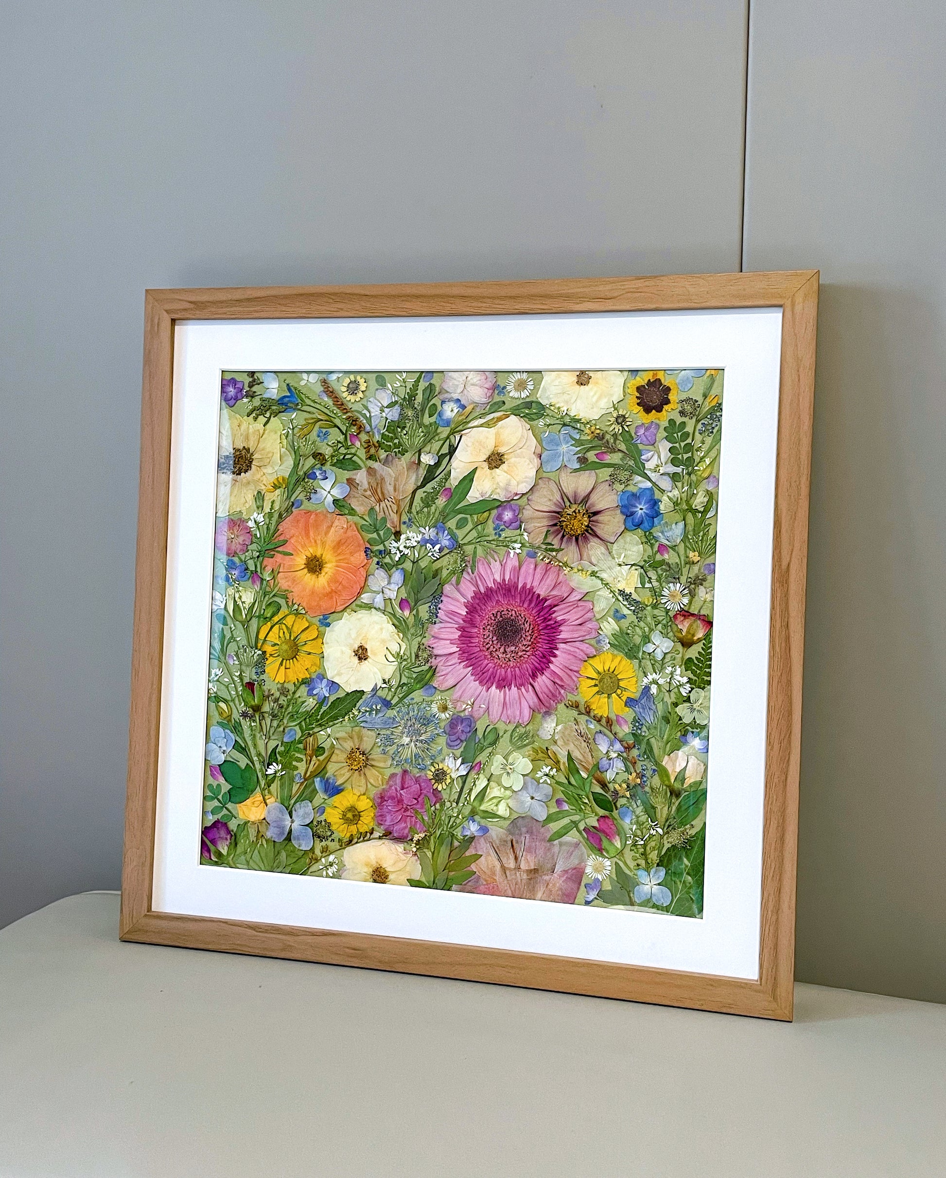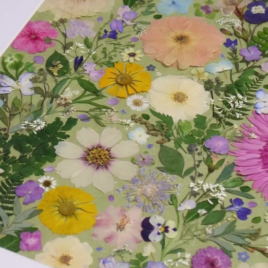 Il s'agit d'une œuvre d'art encadrée de fleurs pressées de grande taille. Notre fleuriste dispose et colle soigneusement des pétales de fleurs séchées sur un papier de fond, créant ainsi un motif unique. Chaque pétale provient des plus belles fleurs de saison, méticuleusement sélectionnées et pressé par nos fleuristes qualifiés.