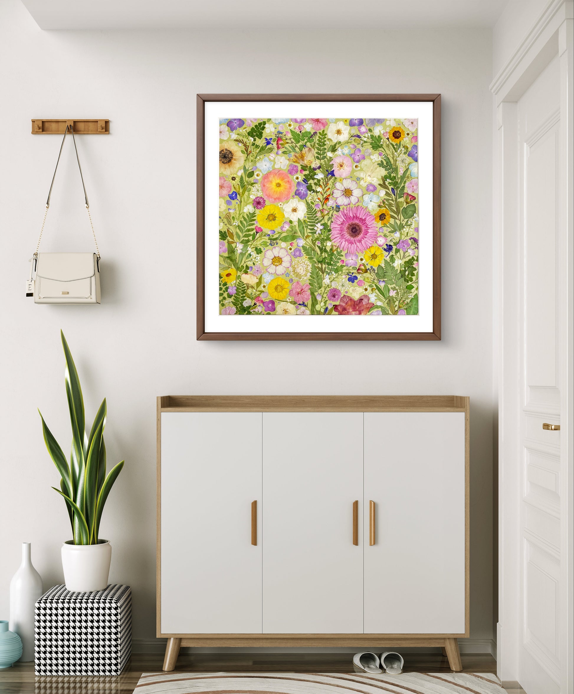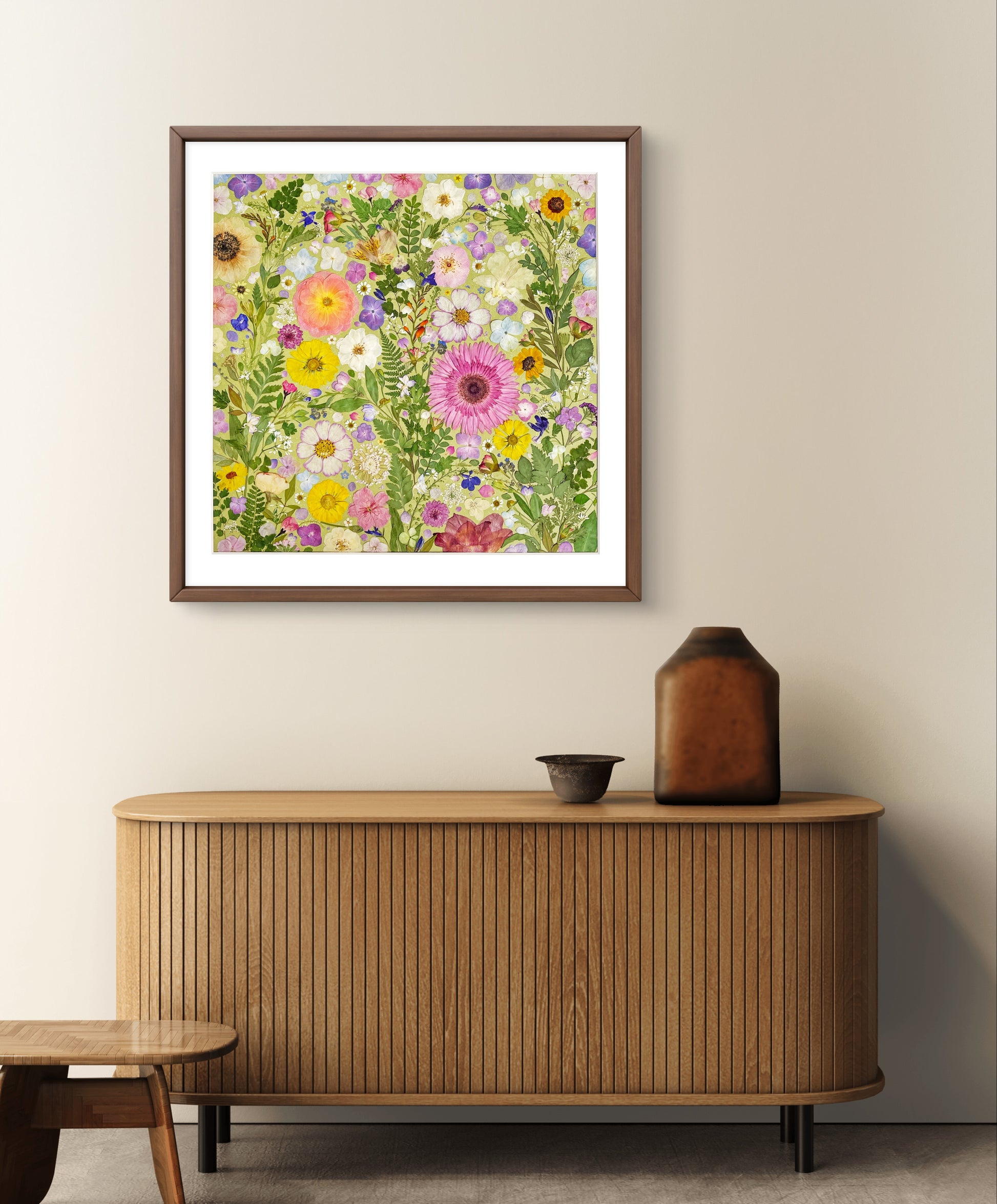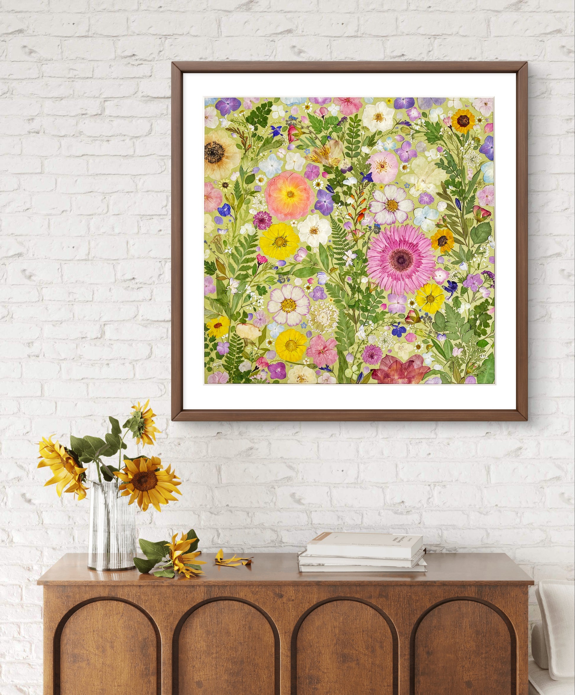 Il s'agit d'une œuvre d'art encadrée de fleurs pressées de grande taille. Notre fleuriste dispose et colle soigneusement des pétales de fleurs séchées sur un papier de fond, créant ainsi un motif unique. Chaque pétale provient des plus belles fleurs de saison, méticuleusement sélectionnées et pressé par nos fleuristes qualifiés.
