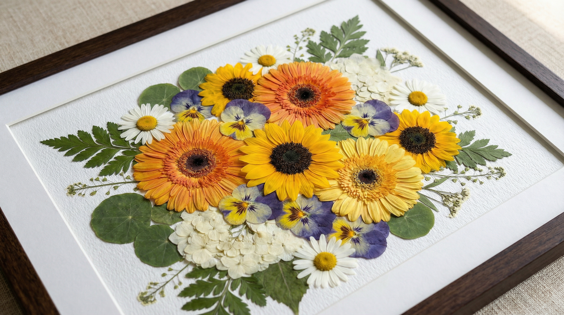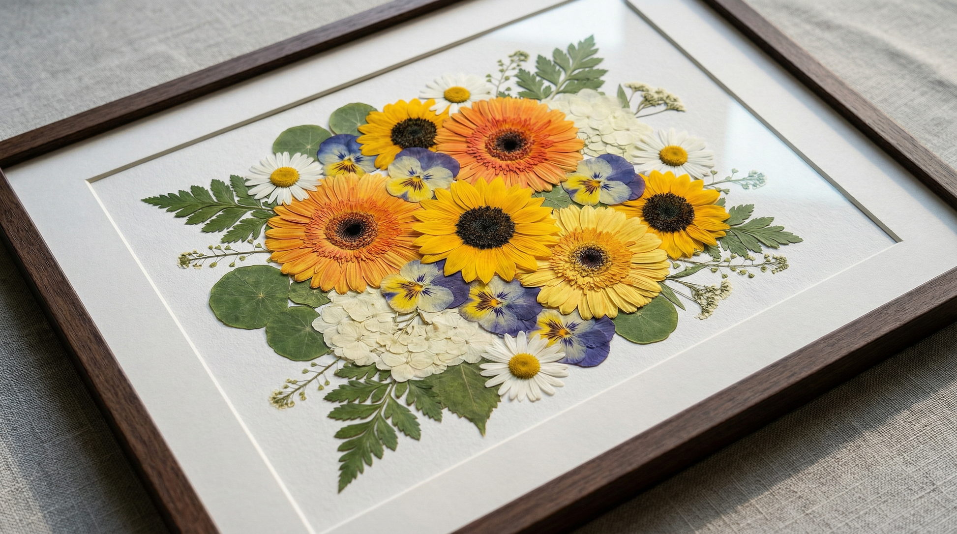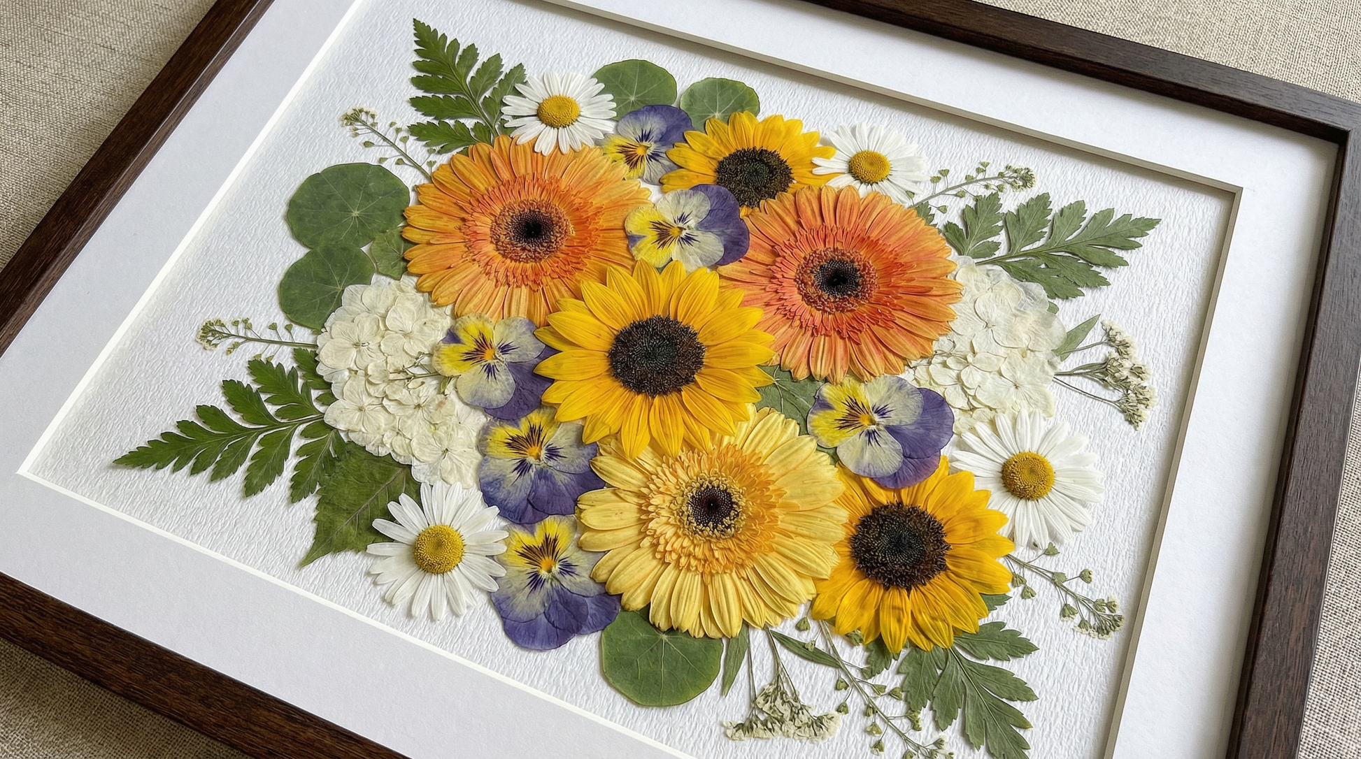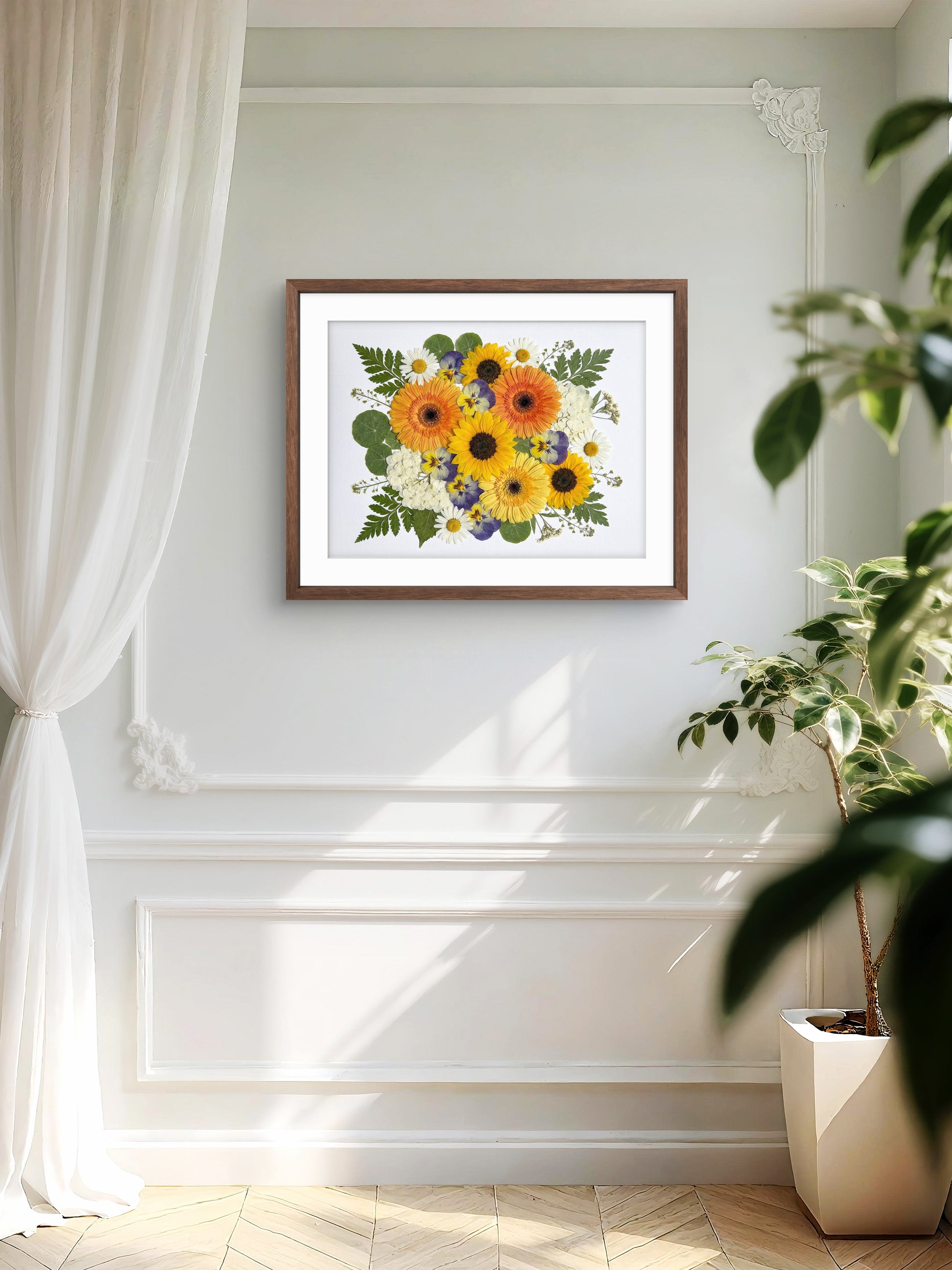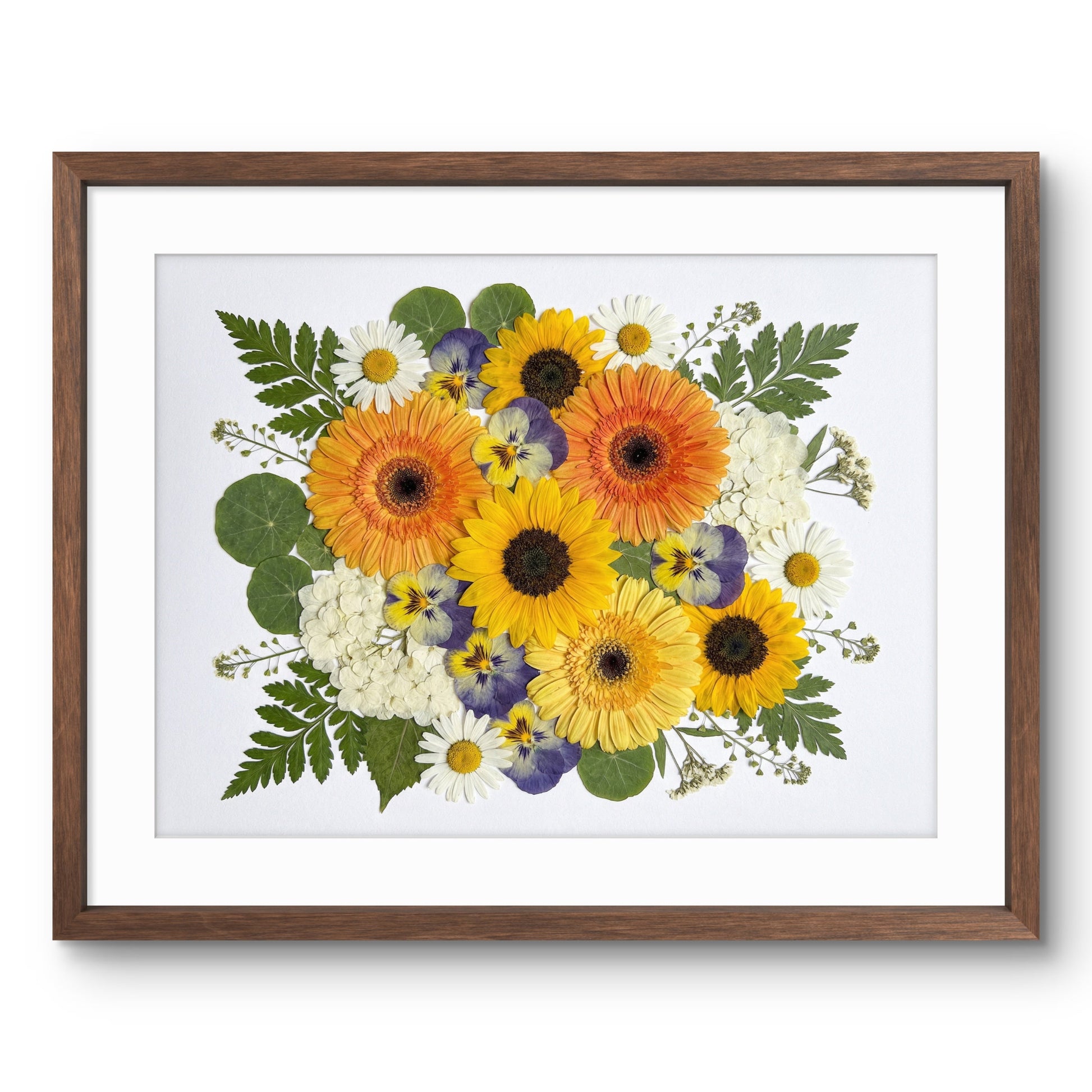 Notre fleuriste dispose et colle avec soin des pétales de fleurs séchées sur un fond en papier, créant ainsi un motif unique. Chaque pétale provient des plus belles fleurs de saison, méticuleusement sélectionnées et pressées par nos fleuristes expérimentés.