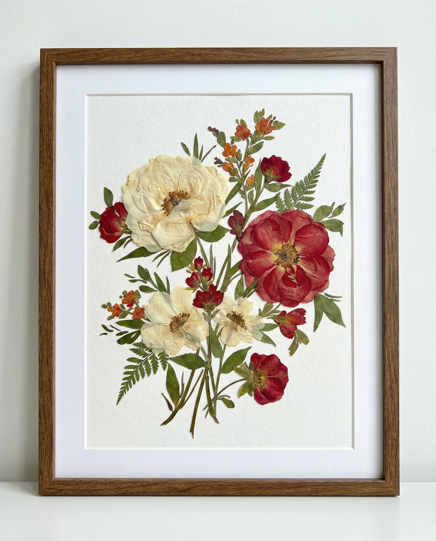 Notre fleuriste dispose et colle avec soin des pétales de fleurs séchées sur un fond en papier, créant ainsi un motif unique. Chaque pétale provient des plus belles fleurs de saison, méticuleusement sélectionnées et pressées par nos fleuristes expérimentés.
