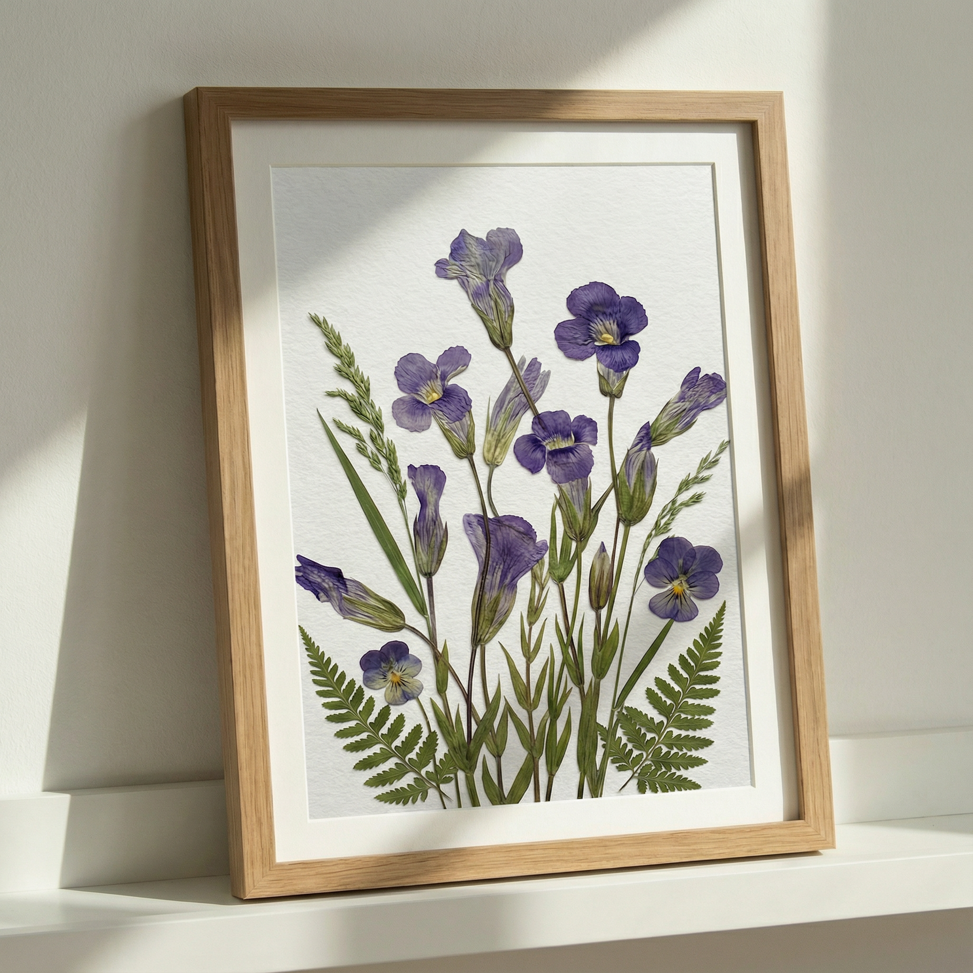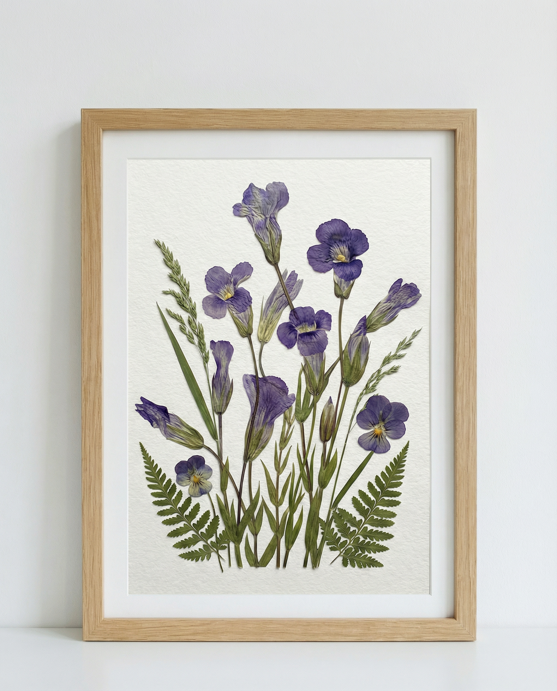 ▪ Matériaux : Campanules violettes, pensées violettes (viola), frondes de fougère et fines feuilles de graminées sauvages.